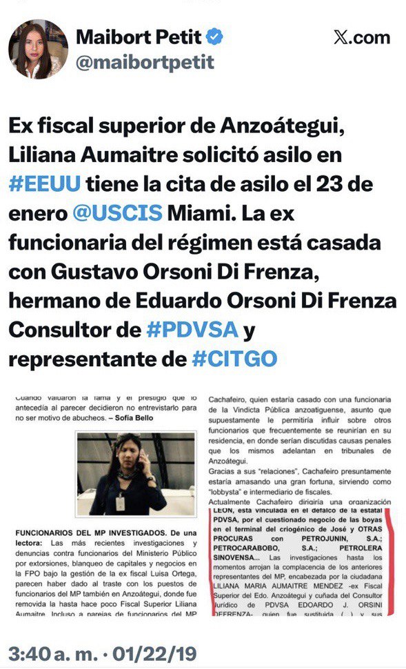 Ayer publiqué un trabajo donde expuse con detalles quién es Liliana Aumaitre, actual pareja de Iván Simonovis. En cualquier país serio, la persona que tenga a su cargo el liderazgo de la oposición —como se supone tiene María Corina Machado—, cuyo principal aval para conservar dicha vocería es la “bendición” del presidente Donald Trump, le hubiera exigido explicaciones públicas a Simonovis y su separación inmediata de cualquier cargo, misión o actividad que lo vincule con la lideresa.